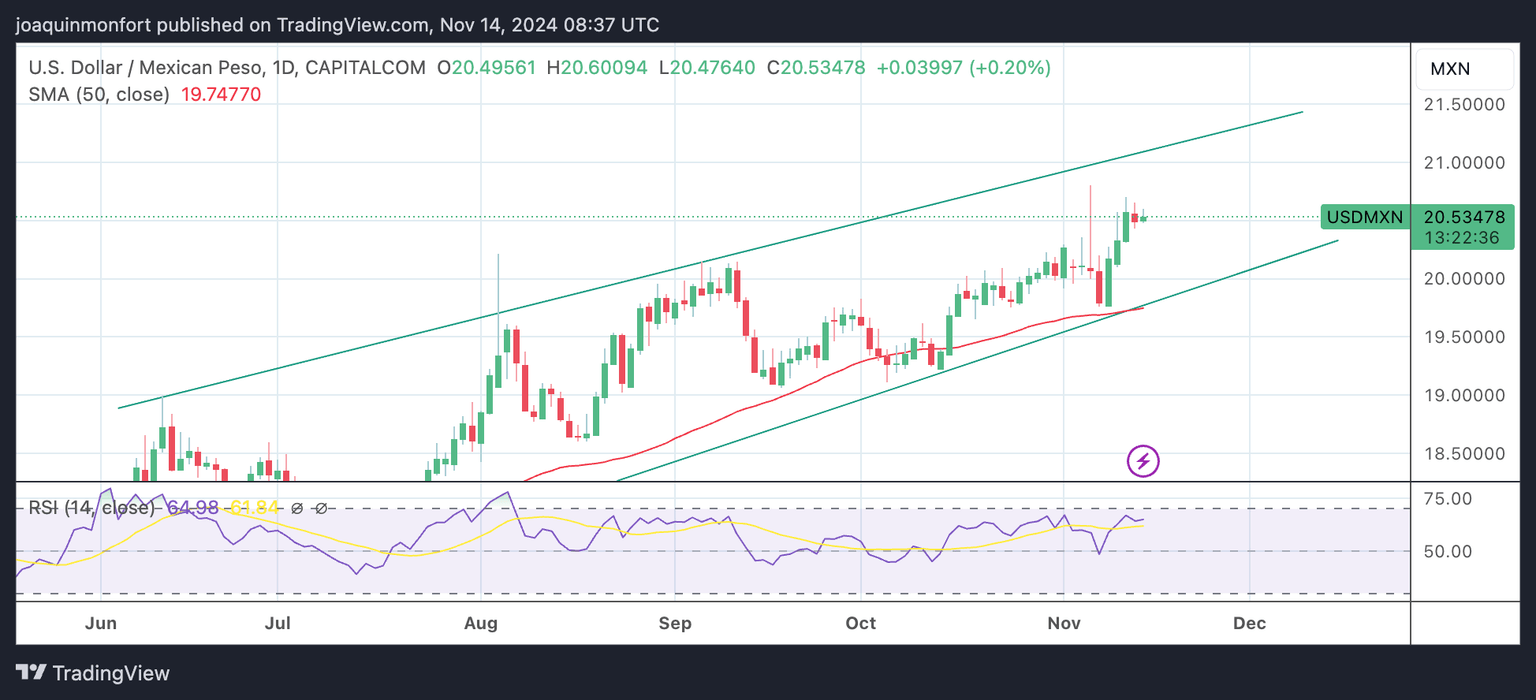 - The Mexican Peso is resuming its downtrend after Republicans have won a majority in Congress.