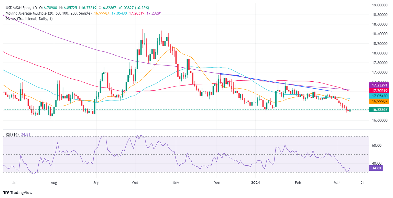 The Mexican Peso loses some ground on Tuesday against the US Dollar, which appreciated following February’s inflation report in the United States that showcased price level growth remaining stubbornly high. This led to the selling of US Treasuries. Consequently, yields rose, a tailwind for the Greenback. The USD/MXN trades at 16.80, up 0.04%, after hitting a daily low of 16.76.