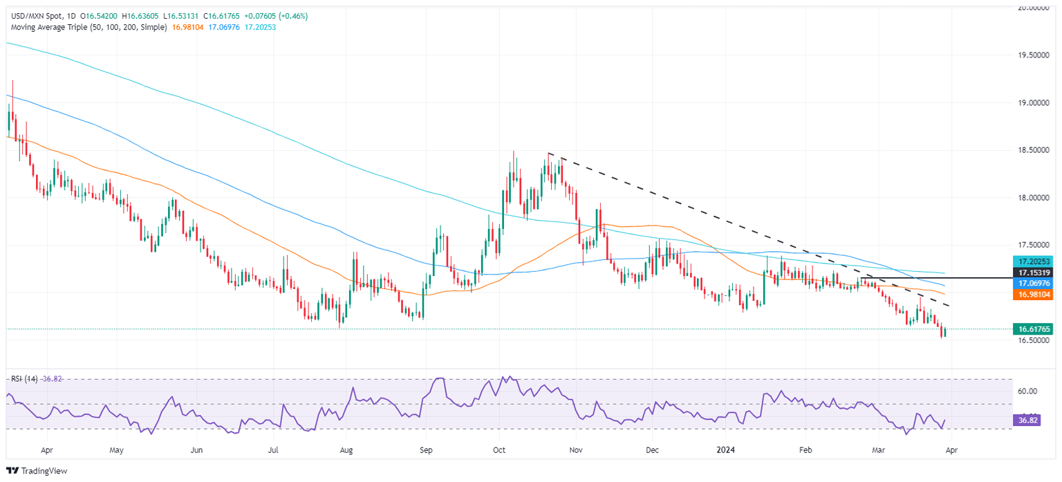 The USD/MXN posted a reversal after dropping to a multi-year low of 16.51, with buyers emerging at around those levels, lifting the exchange rate to the 16.60 region. Nevertheless, they’re facing strong resistance at the previous year's low of 16.62, which turned resistance. A breach of the latter will expose January’s monthly low of 16.78, followed by the March 19 high at 16.94. Up next would be the 50-day Simple Moving Average (SMA) at 16.97.