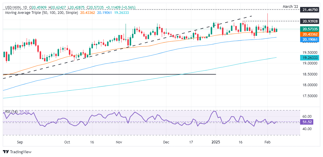 USD/MXN has consolidated within the 20.30 – 20.70 area for the last four days, following Monday’s volatile session due to Trump’s tariffs on Mexico. The pair remains upward biased, with strong support at the 50-day Simple Moving average (SMA) at 20.57.