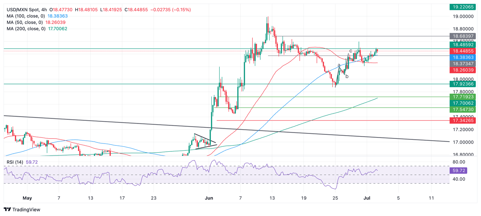 USD/MXN manages to continue higher after pulling back from its June 28 swing high at 18.59 – it is now not so far away, trading in the 18.40s.