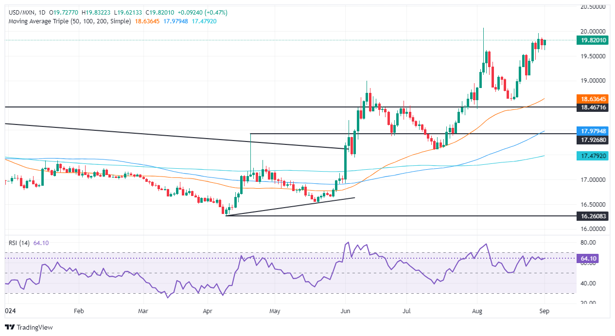 Technical outlook: Mexican Peso weakens as USD/MXN climbs above 19.70