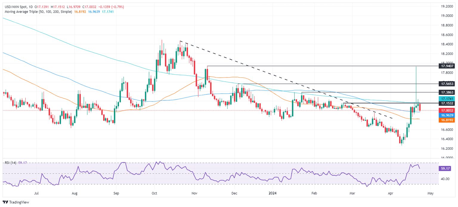 Mexico’s economic docket revealed on Monday that economic activity in February 2024 improved, though it failed to boost the Peso. Traders are expecting the release of mid-month inflation figures for April, with core inflation expected to dip further, while the headline Consumer Price Index (CPI) is foreseen remaining unchanged. If the disinflation process shows signs of evolving, that could influence the Bank of Mexico (Banxico) to continue to cut rates, which remain elevated at 11.00%.