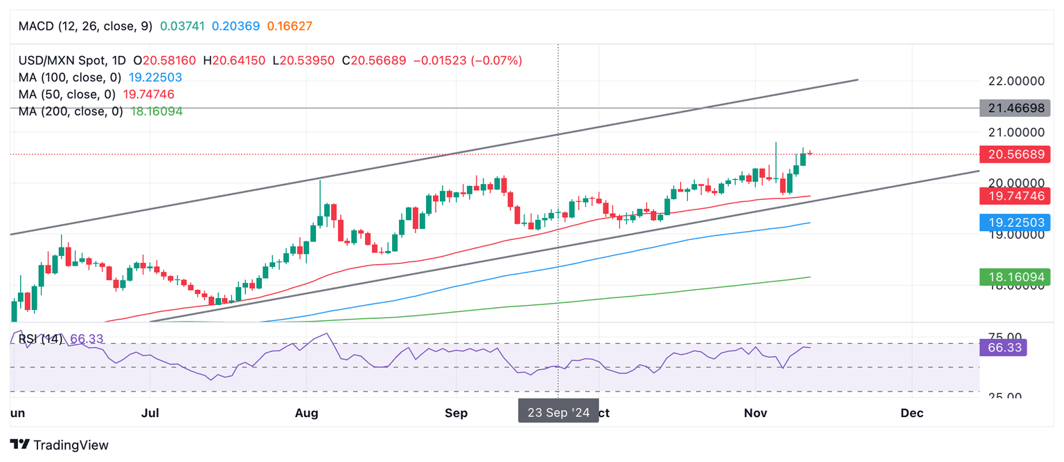 The Mexican Peso has depreciated as markets price in the impact of Donald Trump’s proposed policy agenda on the Mexican economy. Trump is expected to implement high tariffs on Mexican goods entering the US, especially Chinese electric vehicles that are manufactured across the border in Mexico. The appointment of Mike Waltz as National Security Advisor and Marco Rubio as Secretary of State in the US are particularly bad signs from this perspective because of their known tough stance on China. Tariffs are expected to reduce demand for foreign imports, which in turn is likely to lower demand for the Mexican Peso too.