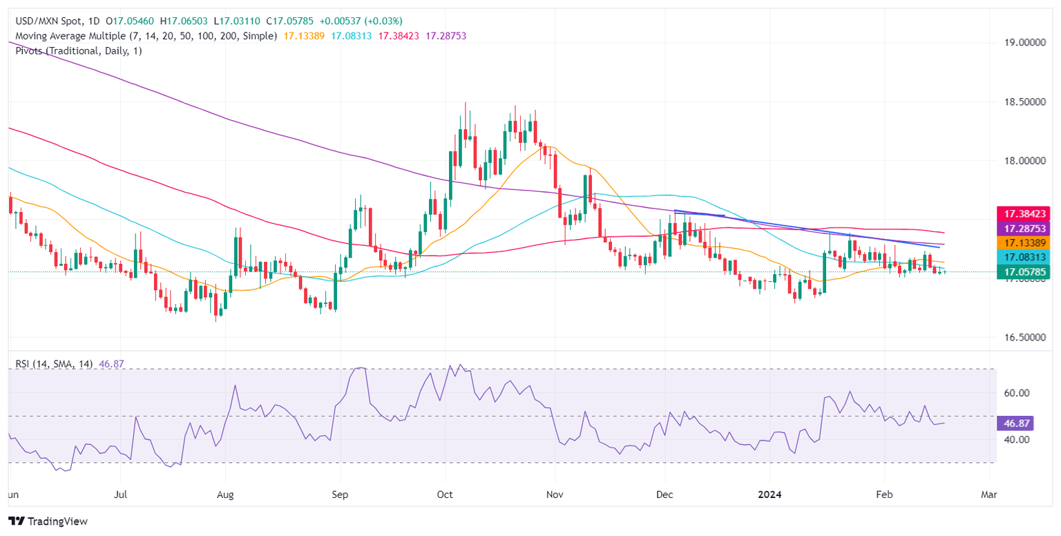 The Mexican Peso seesaws against the US Dollar on Monday as low volume trading is due to the United States observing Presidents’ Day. The Indicator of Economic Activity (IOAE), which provides preliminary readings on a monthly basis, suggests the Mexican economy most likely contracted in January 2024. The USD/MXN trades at 17.05, almost flat, at the time of writing.