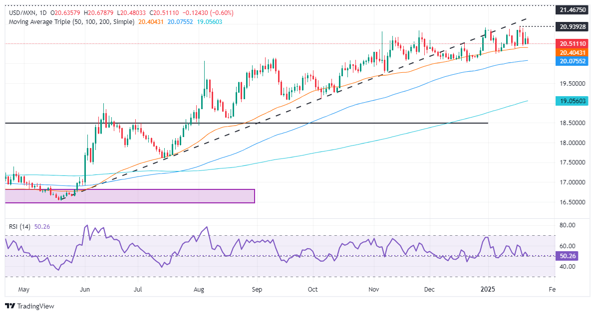 The USD/MXN remains upward biased despite falling below the 20-day Simple Moving Average (SMA) at 20.55. The pair travels around the 20.45 – 20.55 range amid the lack of a clear bias, but the Relative Strength Index (RSI) hints that in the near term sellers are in charge.