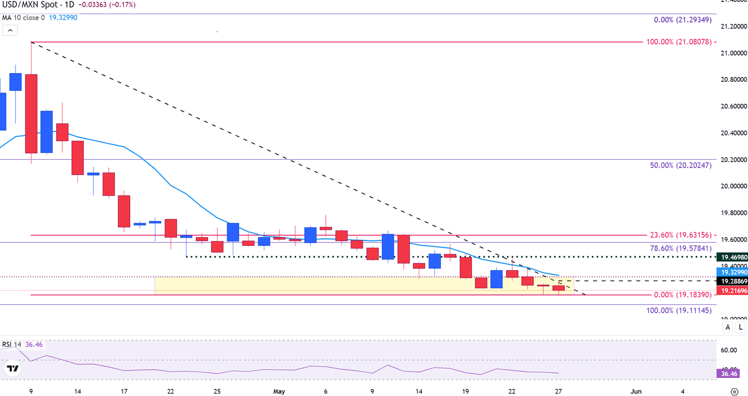 USD/MXN continues to trade within a downward trend, with prices capped beneath the 10-day Simple Moving Average (SMA) at 19.33.