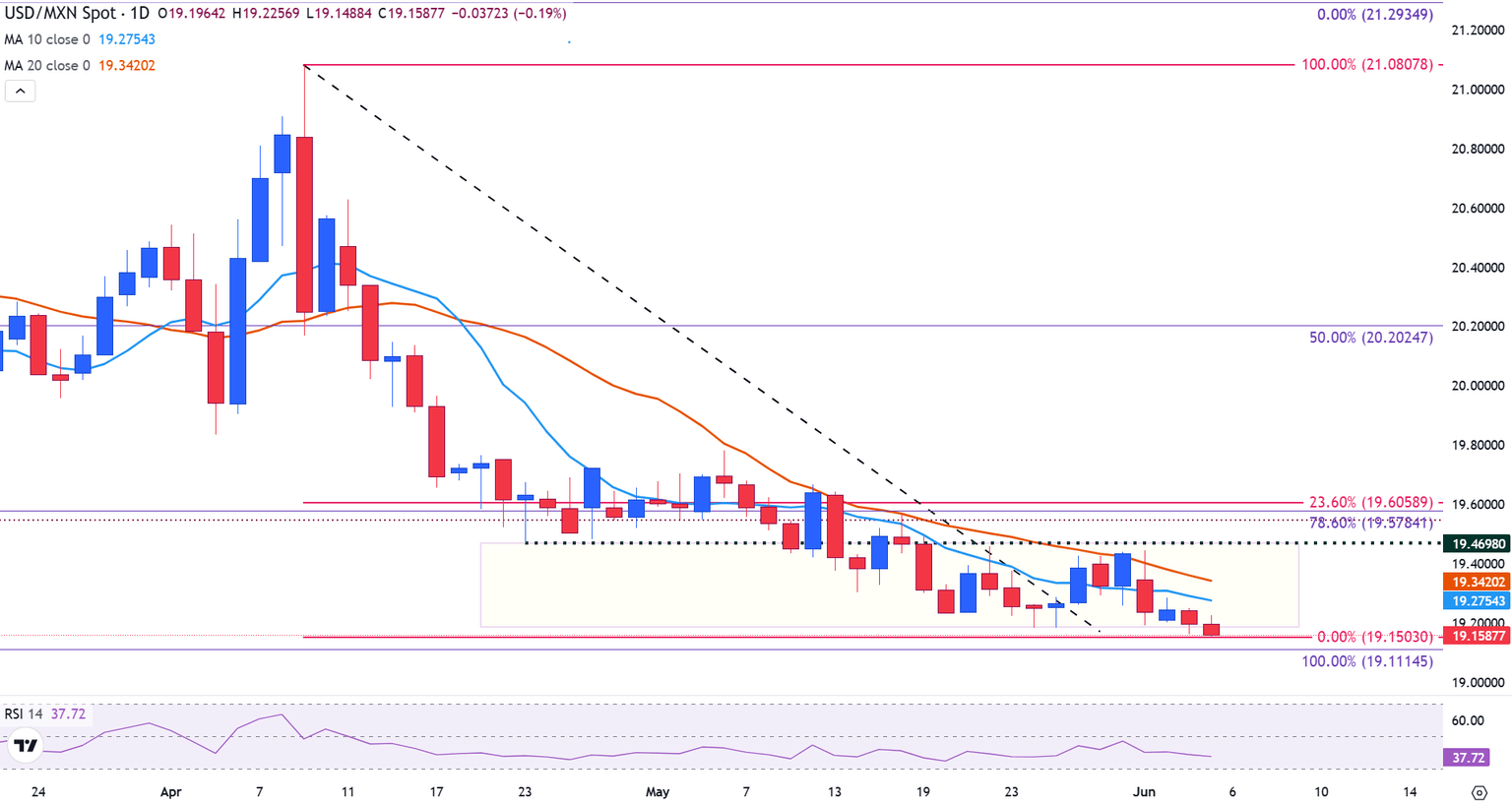 For the United States, attention now turns to Friday’s release of the US Nonfarm Payrolls report, a key labor market indicator that could influence the Federal Reserve’s policy outlook. Analysts expect the US economy to have added 130,000 jobs in May, marking a slowdown from the 177,000 gain in April. The Unemployment Rate is expected to hold steady at 4.2%. Mexican Peso daily digest: USD/MXN monitors US-Mexican relations, US labour market conditions