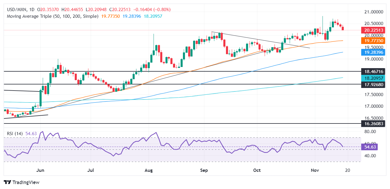 The USD/MXN uptrend remains intact with the Peso gaining some territory. If bears want to regain control, they must push the exchange rate below 20.00. A breach of the latter would expose the 50-day Simple Moving Average (SMA) at 19.75, followed by the psychological 19.50.