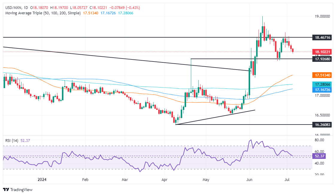 The USD/MXN extended its losses to three consecutive days, with the pair clearing the next psychological support at 18.10, which exacerbated a test of the 18.05 figure earlier during the day. Momentum hints that buyers lost steam as depicted by the Relatives Strength Index (RSI), which points downwards about to pierce the 50-neutral line despite remaining bullish.