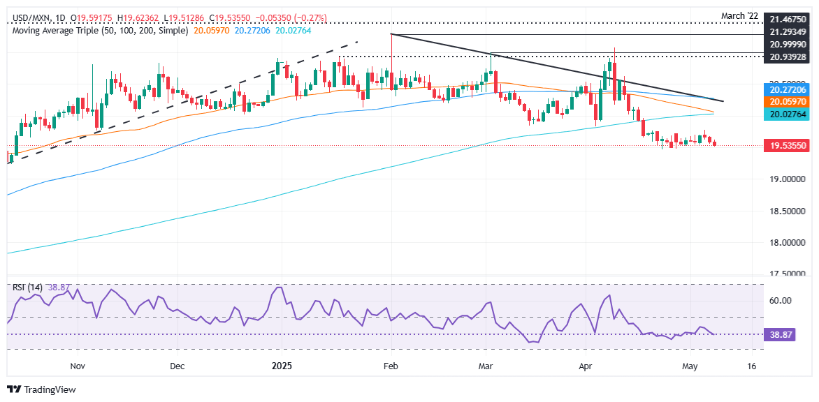 If USD/MXN drops below 19.46, the next support would be the 19.00 psychological figure. Conversely, if USD/MXN climbs past 19.78, expect a test of the 200-day SMA at 19.98. A breach of the latter will expose the 20.00 mark.