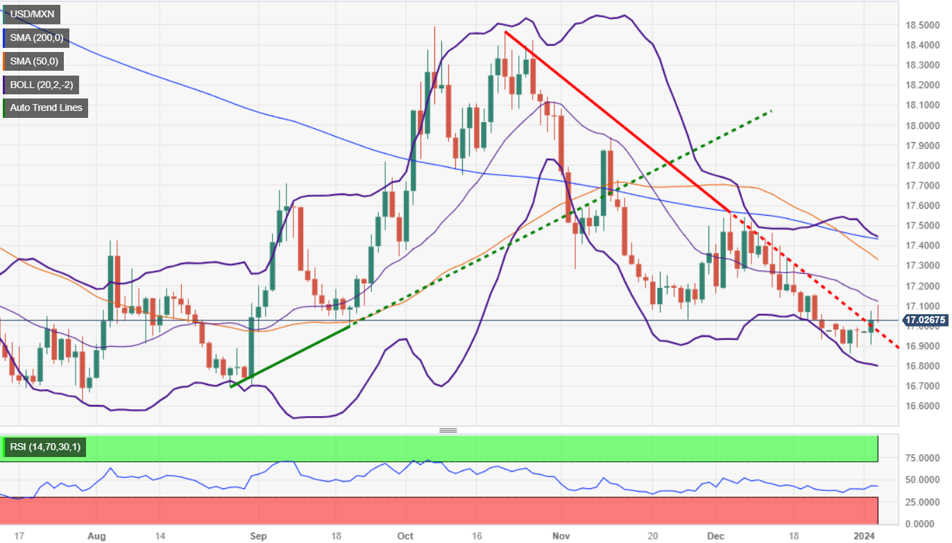 The Mexican Peso (MXN) began the year on a lower note against the US Dollar (USD) after the exotic pair dipped to a three-month low on December 28 at 16.86. Even though US Treasury bond yields shifted negatively, the Greenback (USD) remains higher, consequently underpinning the USD/MXN pair. At the time of writing, the exotic pair trades in the 17.03 area, posting a minuscule gain of 0.03%.