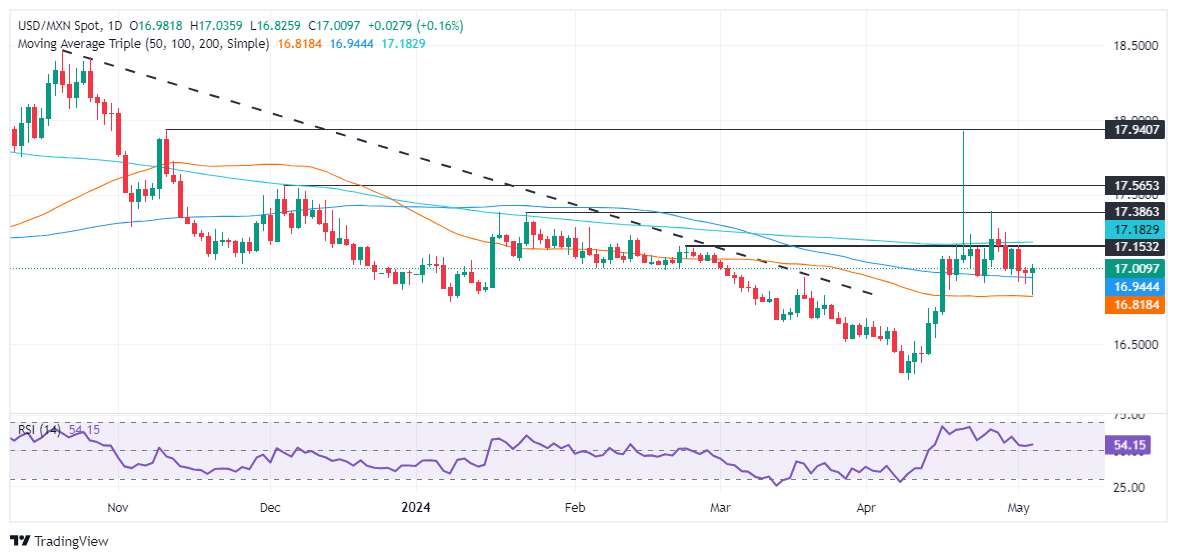Meanwhile, the Bank of Mexico (Banxico) April poll showed that private economists estimate inflation to end at 4.2% in 2024, underlying prices at 4.1%, and the economy to grow by 2.25%. Regarding the USD/MXN, analysts revised their projections downward from 18.10 to 17.