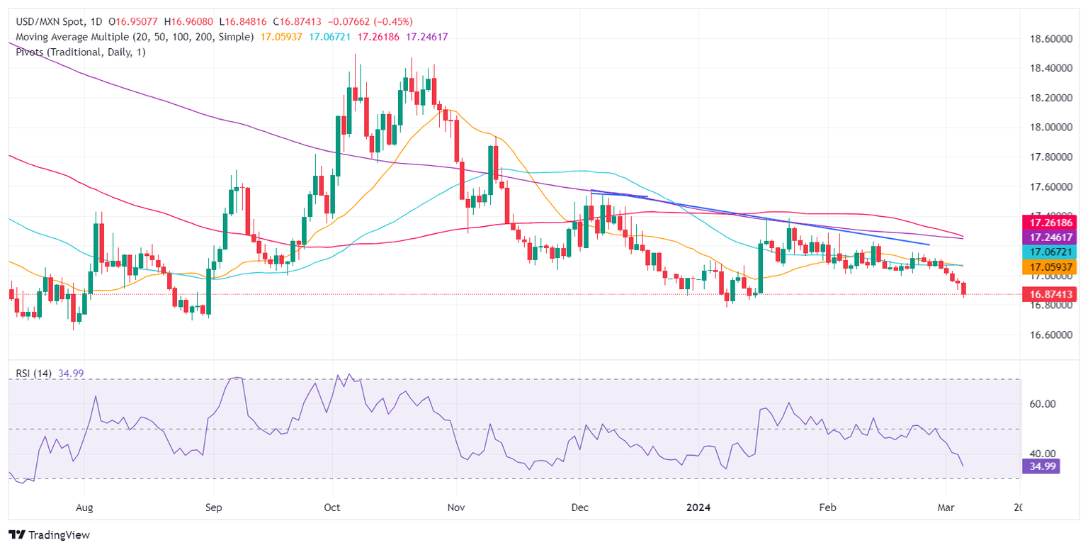Technical analysis: Mexican Peso rally extends as USD/MXN tumbles below 16.90