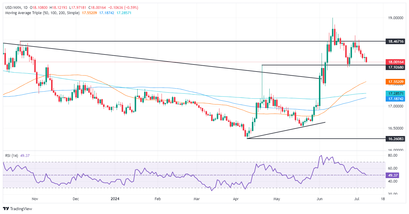 - Mexican Peso rallies as USD/MXN drops below 18.00 and hits lowest level since June 25.