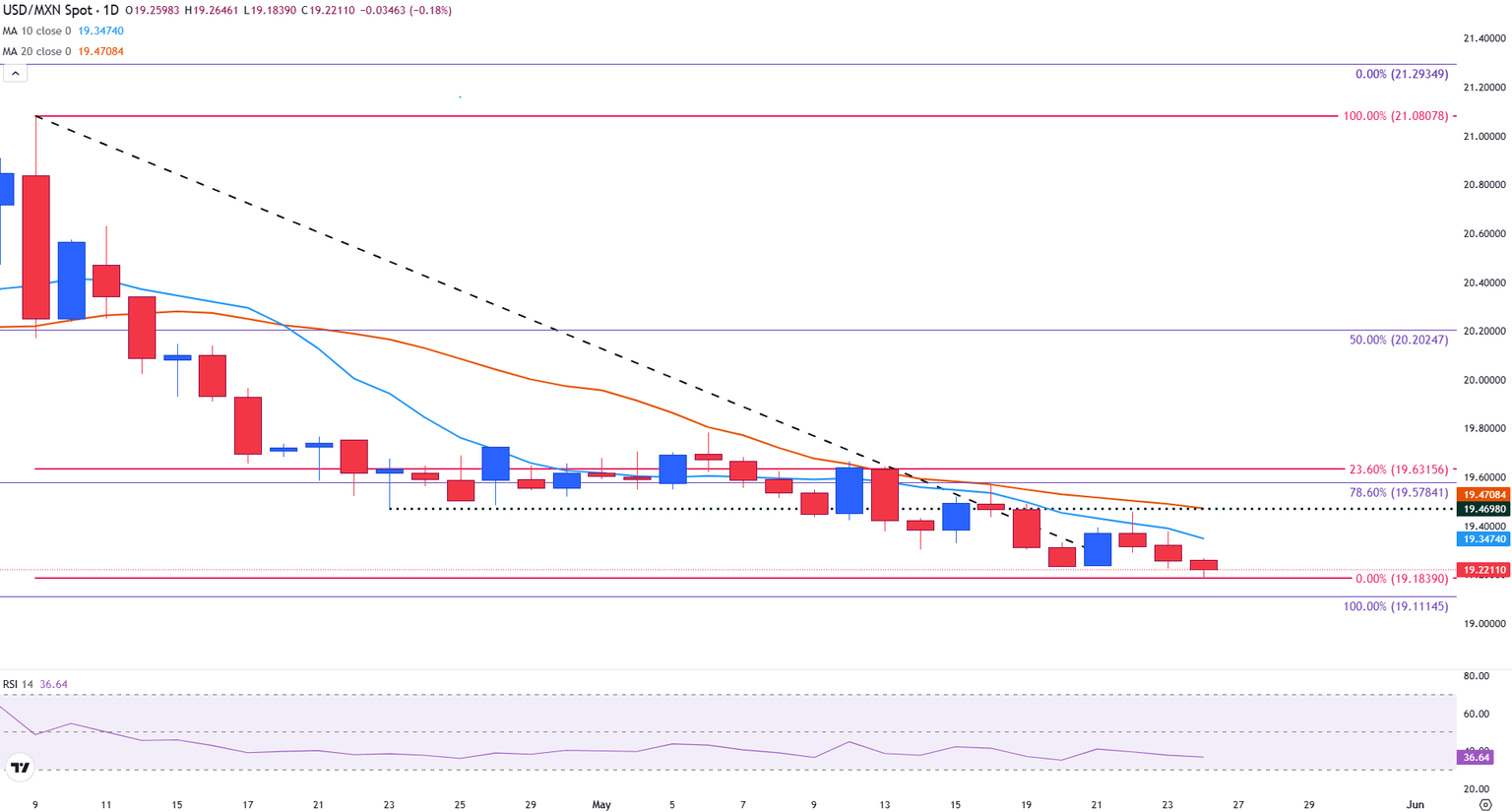 With US markets closed for Memorial Day on Monday, the Mexican Peso remains resilient, with the USD/MXN pair trading at around 19.22, down 0.18%, at the time of writing.