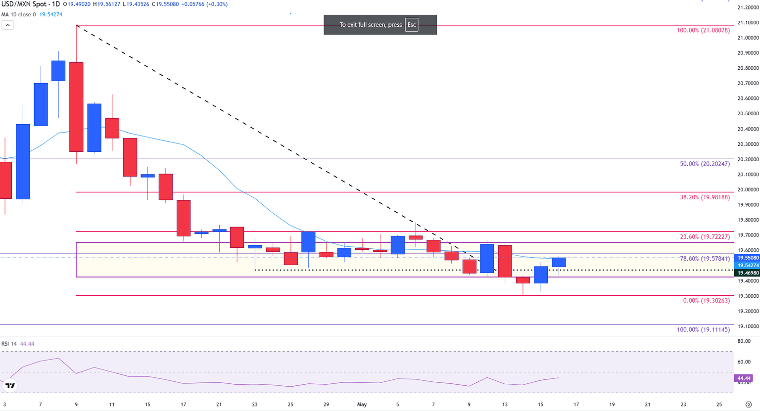 USD/MXN continues to face downside pressure, trading just above the 19.50 mark after slipping below the 78.6% Fibonacci retracement of the October–February rally at 19.57.