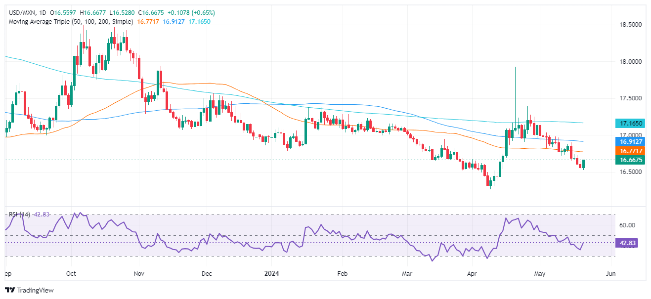 Mexican Peso registers losses versus the US Dollar during the North American session amid a slew of Federal Reserve (Fed) officials hitting the wires. Data from Mexico suggests the economy barely grew in April, according to the Instituto Nacional de Estadistica Geografia e Informatica (INEGI), ahead of revealing the release of the Gross Domestic Product (GDP) figures on May 22. Therefore, the USD/MXN trades at 16.64, up 0.30%.