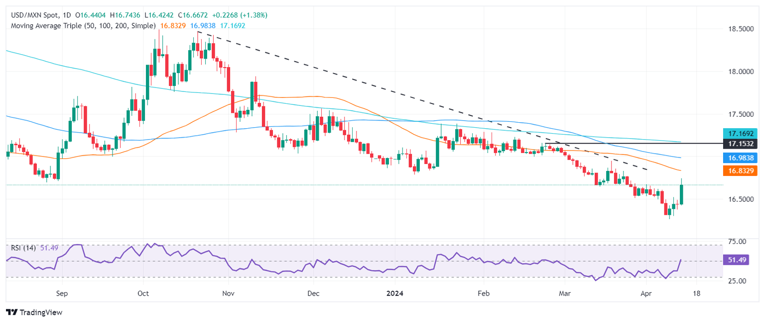 The Mexican Peso plummets sharply against the US Dollar on Friday amid a risk-off impulse on speculation that Iran might attack Israel over the weekend. Alongside surprisingly hawkish comments by Boston Federal Reserve President Susan Collins, these worries derailed the emerging market currency, which could end the week with losses. The USD/MXN trades at 16.68, after hitting a daily low of 16.40, up 1.50%.