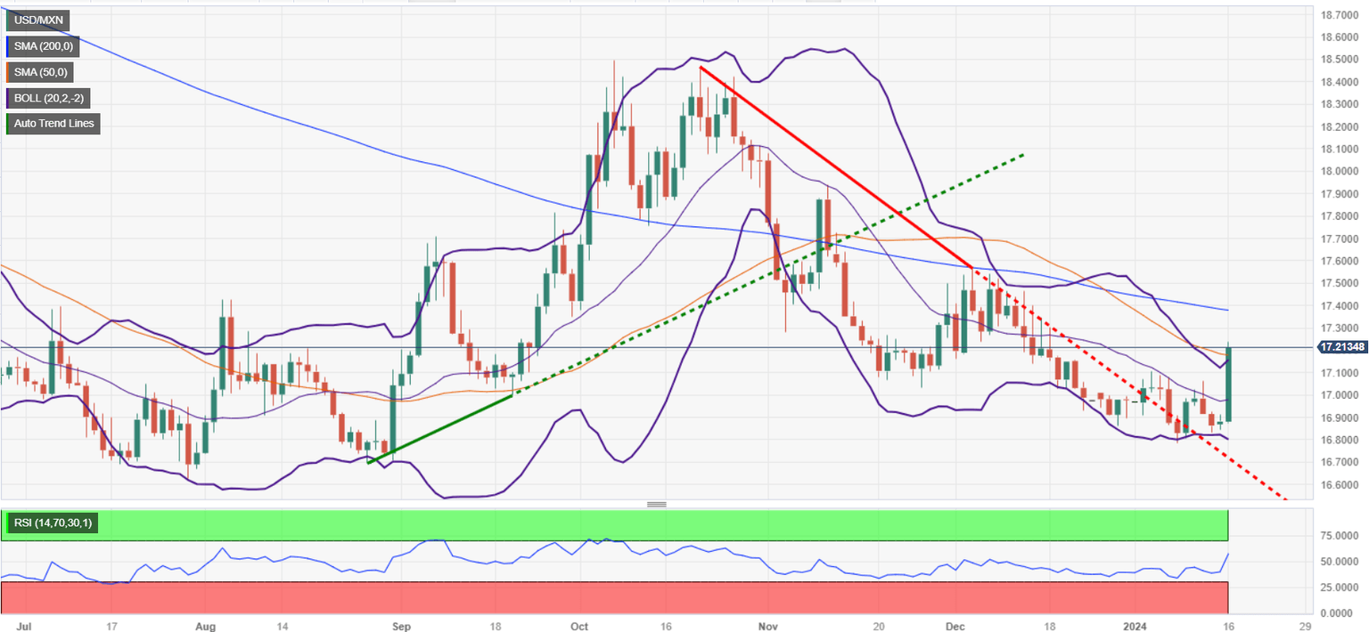 Technical analysis: Mexican Peso slumps sharply as USD/MXN climbs toward 17.15