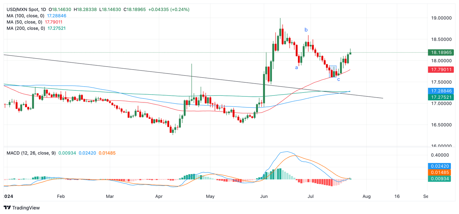 USD/MXN found support at the 50-day Simple Moving Average (SMA) after completing an ABC correction lower, and has rebounded higher, hurdling the 18.00 barrier in the process.