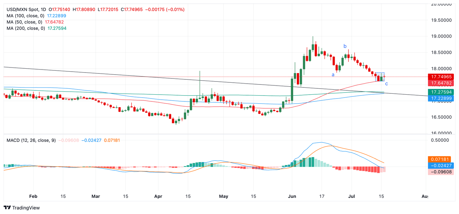 - USD/MXN is showing signs of reversing its recent decline from the June highs.