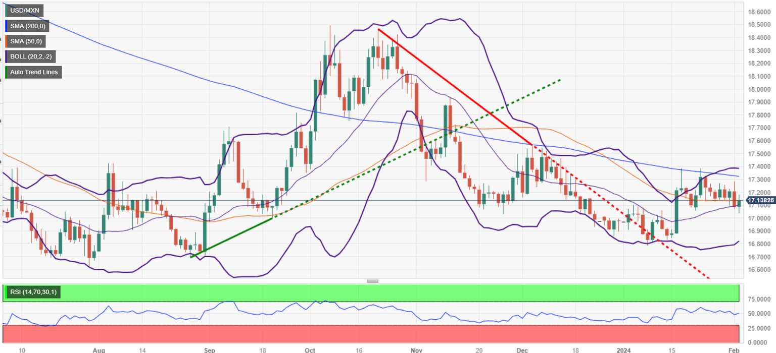 The USD/MXN remains trading sideways, but it has pierced above the 50-day Simple Moving Average (SMA) at 17.13, which could pave the way for further gains. If buyers achieve a daily close above that level, they should remain hopeful of challenging the 200-day SMA at 17.32. That level would be followed by the 100-day SMA at 17.38. Once that area is cleared, the exotic pair could extend its gains to 17.50.