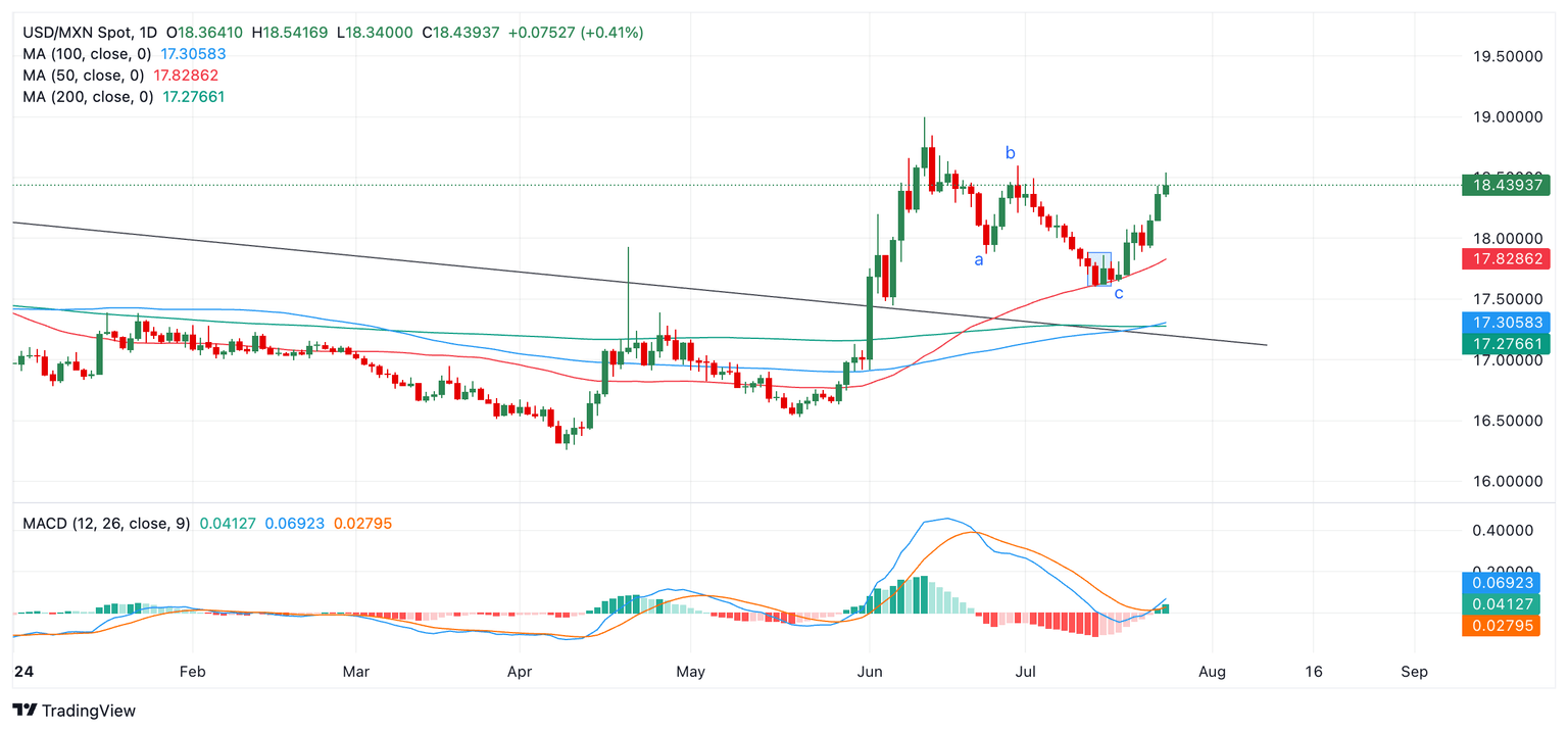 USD/MXN has rebounded higher after completing an ABC correction in early July. It appears to be trending higher and targeting the June 28 high at 18.60.