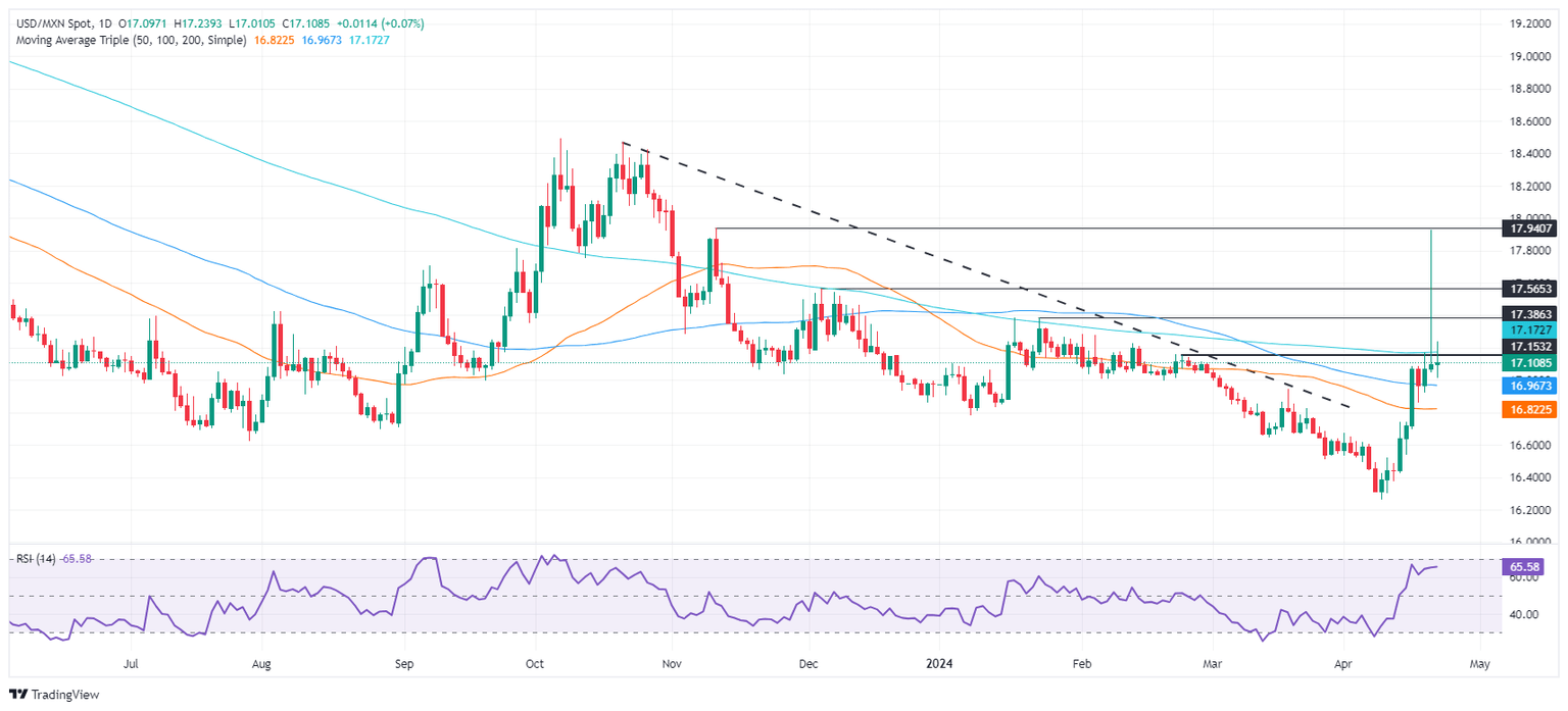 Across the border, the US economic docket revealed the Chicago Fed National Activity Index in March improved, exceeding February’s upward revision, an indication of strength in the economy. That, along with Federal Reserve Chair Jerome Powell saying the lack of progress on inflation warrants keeping current policy restrictiveness, boosts the USD/MXN to stand above the psychological 17.00 figure.