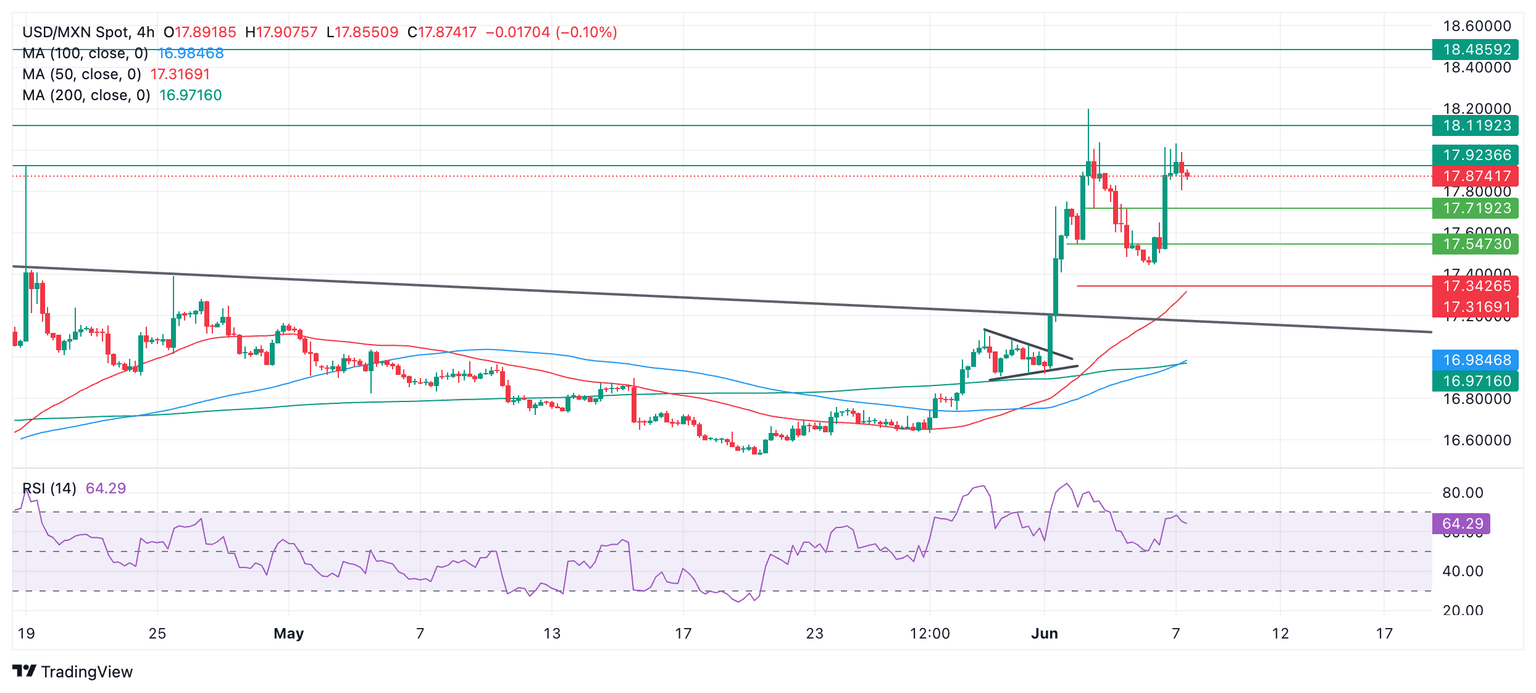 USD/MXN trades back above 18.10 after US Nonfarm Payrolls data released on Friday shows a higher-than-expected 246K new employees started work in May, beating expectations of 185K and a downwardly revised 165K previously.