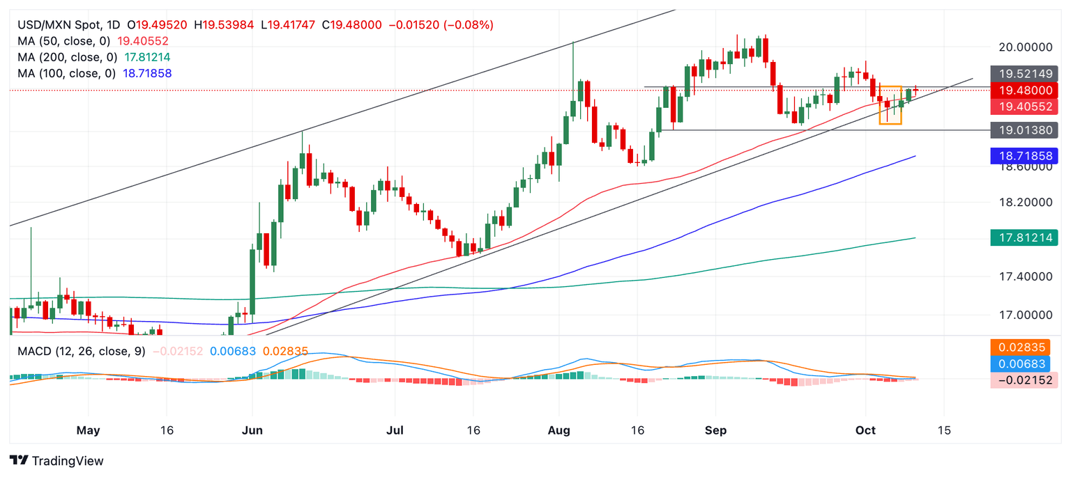 The Mexican Peso (MXN) edges higher against the US Dollar (USD) on Thursday after the release of mixed US data. A higher-than-expected inflation print was overhsadowed by weak US Jobless Claims data for the first week in October.