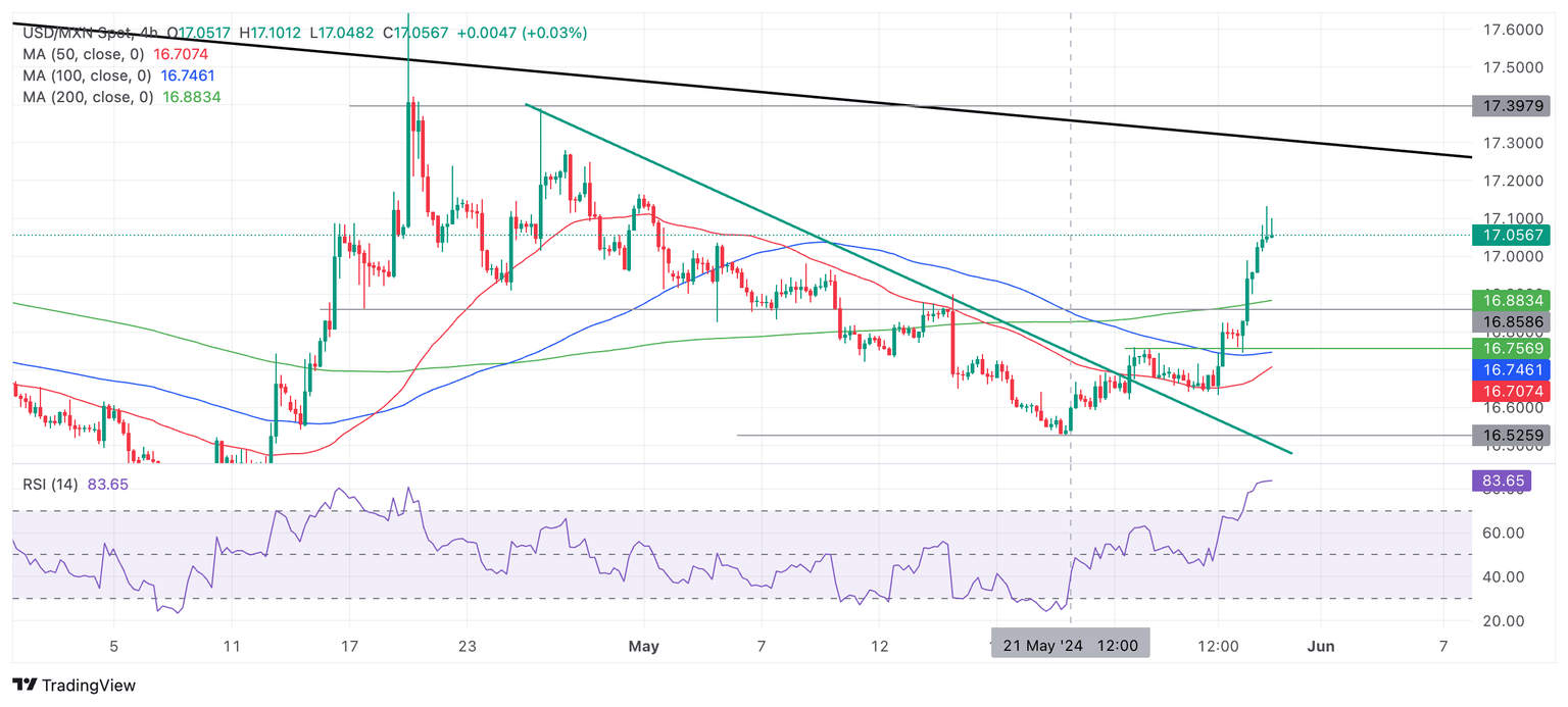 Overall investors are unwinding their MXN long bets due to multiple risk factors on the horizon. The Mexican presidential elections on Sunday, the US presidential elections in November, and a growing shift in US interest-rate expectations are all weighing on the Peso, which is vulnerable to reversing its long-term uptrend, according to analysts.