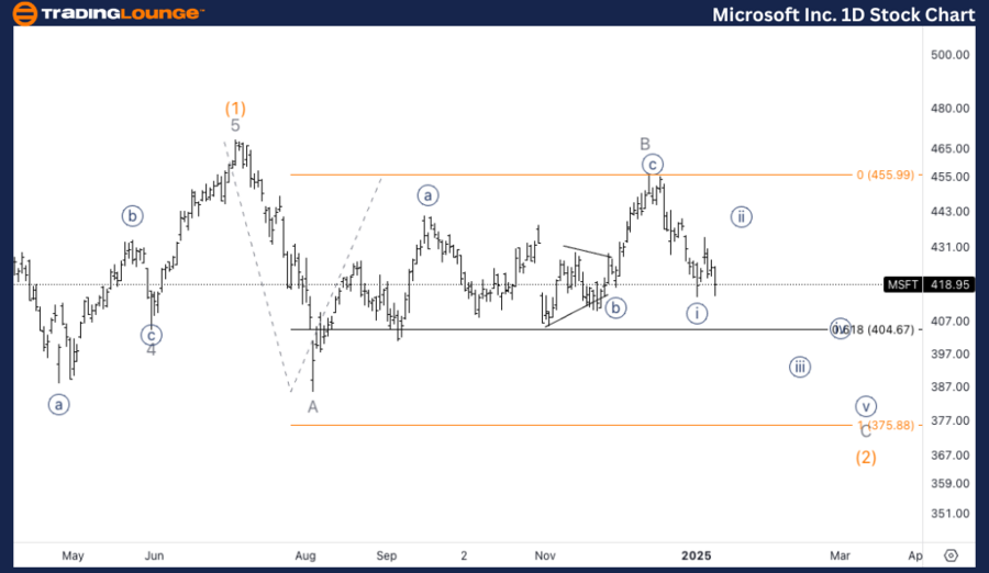 Microsoft appears to be completing a wave C of the corrective wave (2). The downside pressure is evident, and a key level to watch is the $400 mark. If the price breaks and establishes resistance near $400, further downside may be anticipated towards the MinorGroup2 (MG2) support levels around $380, $372, and $365. These levels would serve as potential targets before the correction completes.