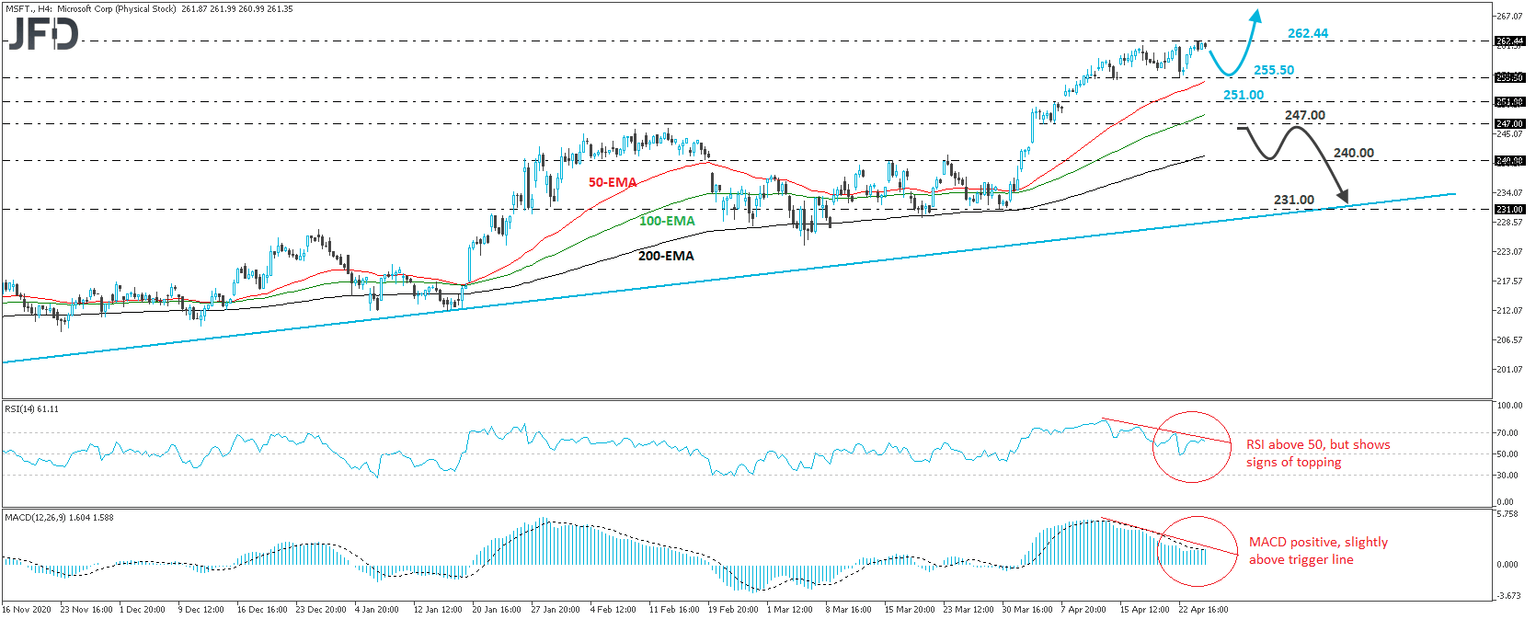 Microsoft Corp. (NASDAQ: MSFT) traded higher yesterday, hitting a new all-time high at 262.44. Then, it continued consolidating below that level for the rest of the session. Overall, the stock remains well above the upside support line drawn from the low of October 30th, and even if it corrects lower, as long as this is the case, we will hold a positive stance.