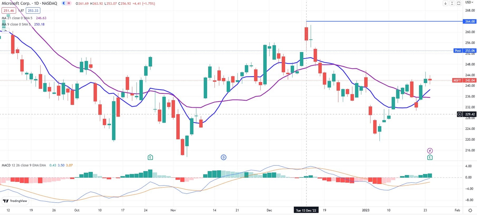 Microsoft stock has jumped above $253 afterhours and will likely take aim at $264 in the coming sessions. That price level coincides with the high from December 13. A close on the daily chart above $264 would mean a new higher high had been achieved. This would likely bring more bulls to the fore. This would imply that the bottom in MSFT shares was in since Microsoft already produced a higher low on January 6, above the range low from November 4. Both the Moving Average Convergence Divergence (MACD) indicator and the 9-day and 21-day moving averages are crossed over currently in bullish mode. This is implies that trades should expect the uptrend to continue until further notice. Support sits at $220.