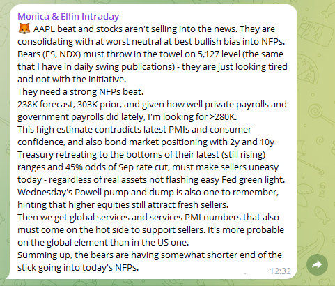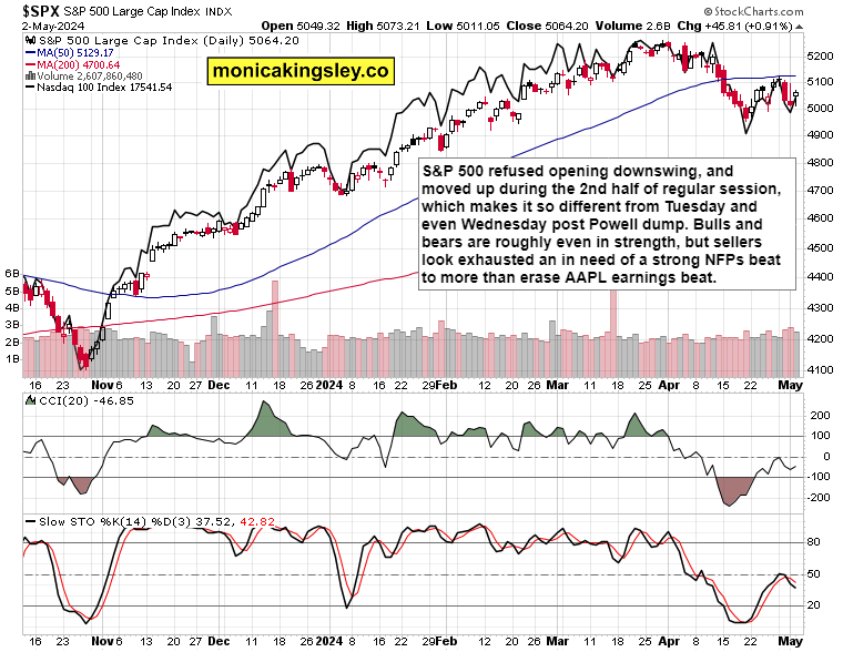 We got S&P 500 going up to 5,092 former support, and also through 5,100 till 5,107 as per my latest Telegram points. AAPL earnings did that, with good old massive share buybacks. $183 is what the giant needs to defend so as not to end like MSFT. The immensely important today‘s data take is to be found in the introduction to the analysis, and bears don‘t deserve more benefit of the doubt than given at the moment therein, in the snapshot.