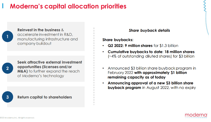 We have already outlined the strong cash position Moderna is in after massive revenues from sales of its covid drugs. In our article Three dividend stocks that look interesting for the long run: BHP, MRNA, BTI, I cheekily included Moderna despite it not yet paying a dividend. With so much cash, however, it will come under pressure to return some to shareholders either via dividends or buybacks. Moderna already has alluded to this in its earnings release.
