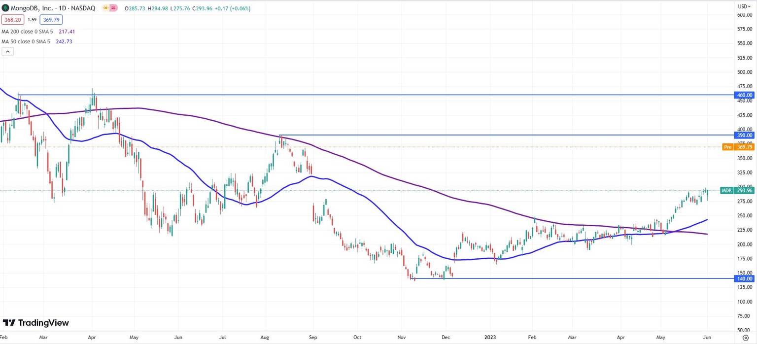 MongoDB stock was already telling traders it was a buy when the daily chart featured a Golden Cross on May 10. This is when the 50-day moving average crosses above its 200-day counterpart. Although the 200-day was rising at the time of the cross (ideally it should be falling too), it may still be a bullish sign for the stock. MDB stock has been in an uptrend since last November, but this current earnings rally is still a bit surprising.