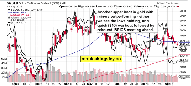 As said in the caption, gold is close to a bottom, and next week before the BRICS summit, is likely to start turning – but before that, wouldn‘t likely escape unscathed from rising yields (except for Monday) - $1930 - $1,935 in Dec gold may be still tested, but is likely to hold.. Silver in the $22.70 is at support, but may dip to $22.50 still.