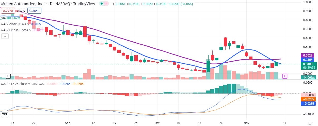 With the sell-off in the premarket, the stock will open right at the 9-day moving average. We are not truly in a bullish situation until it also climbs above the 21-day moving average. That average is currently at $0.36. The Moving Average Convergence Divergence (MACD) already shows a bearish crossover, so Mullen Automotive stock requires another surge to convert that into the other direction. Bulls will still see $0.60, the high from October 25, as the near term price target.