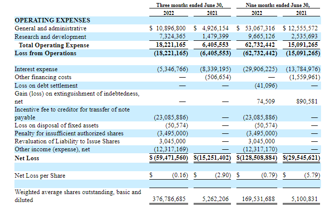 Loss from operations has ballooned from $15 million to nearly $63 million for the 9 months to the end of June 2022 versus the end of June 2021. Shares outstanding have also moved from 5.1 million to more than 376 million, but at least the cash balance has also ballooned.