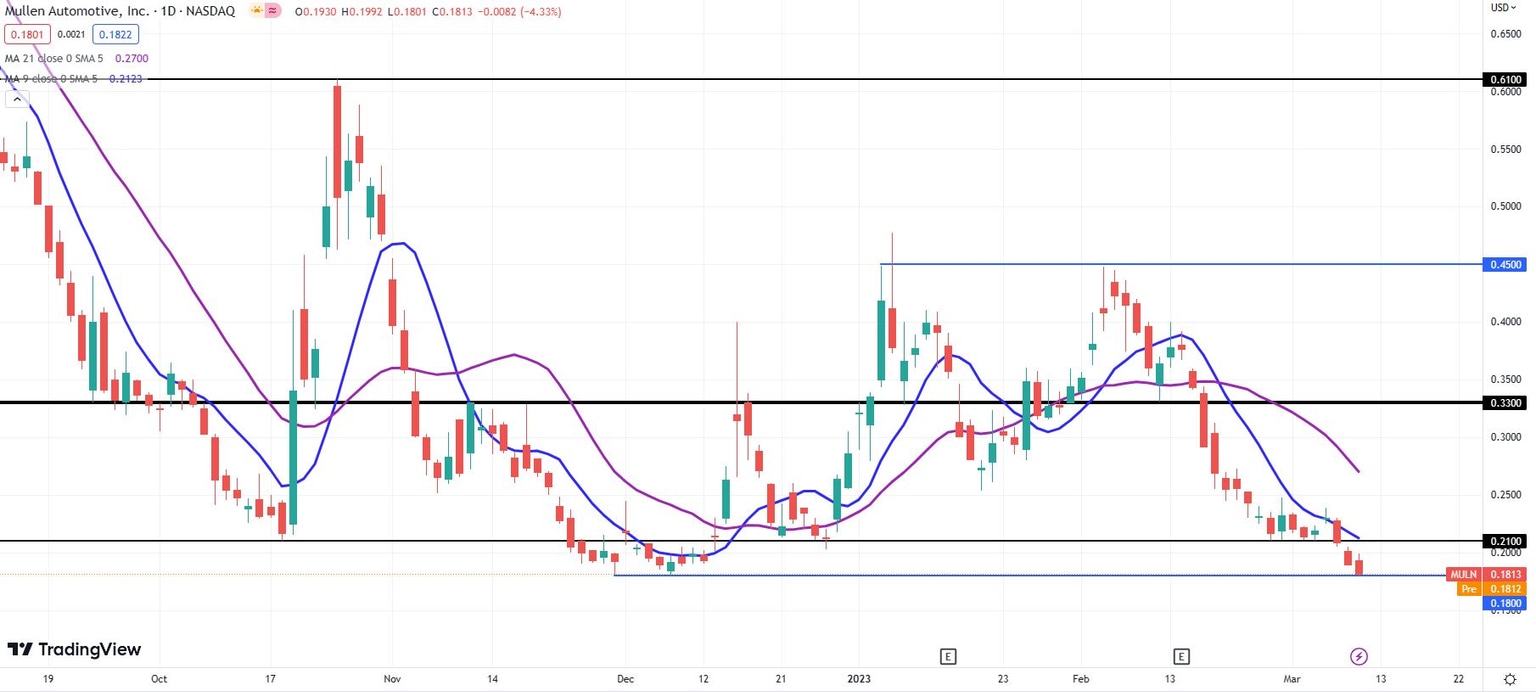 Mullen Automotive (MULN) stock once again finds itself back at $0.18. This is the third time besides November 30 and December 7 that bulls are clinging to the final support level keeping the battered automaker from making new all-time lows. MULN stock lost 4.3% on Thursday to end the session at $0.1813.