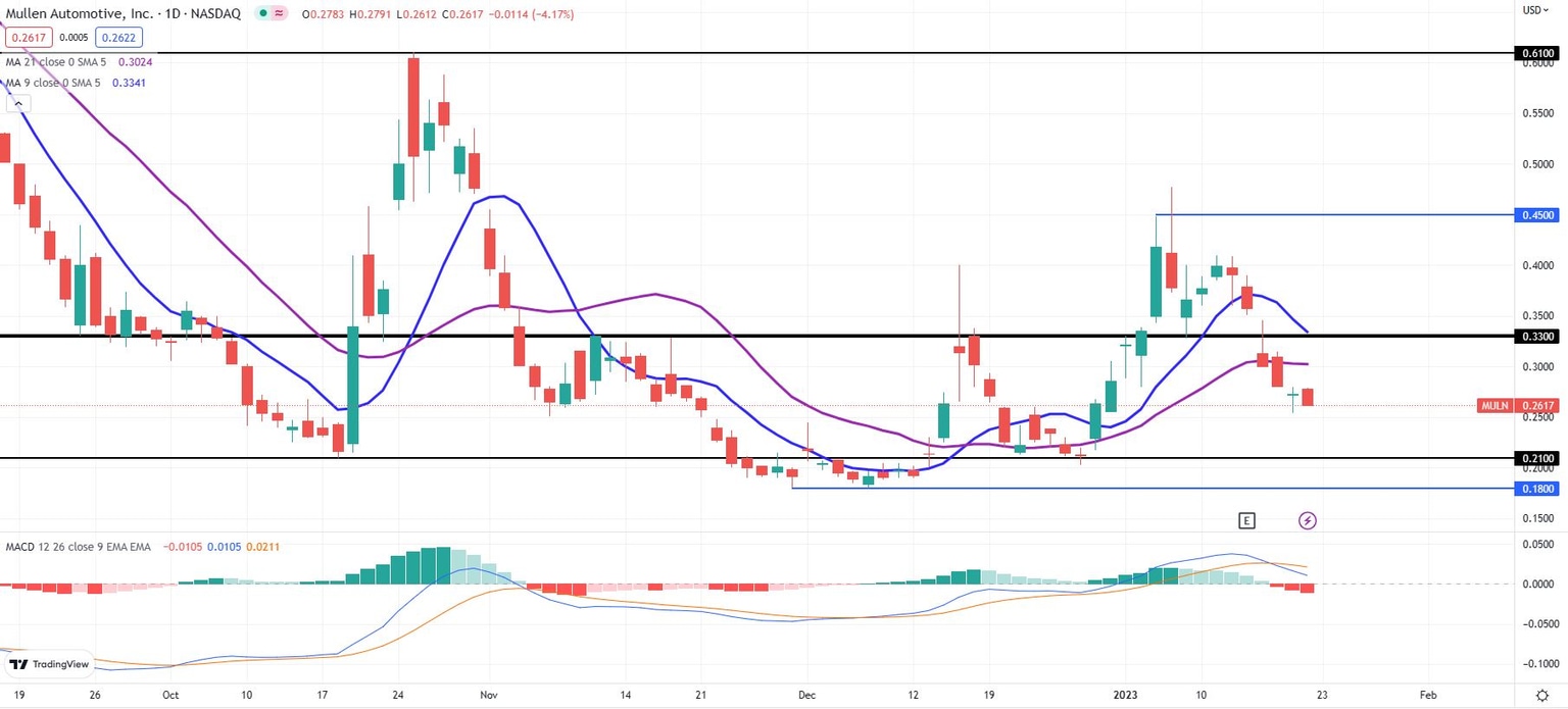 Traders paying attention over the past week are probably already out of the market and waiting for a reentry if anything. When MULN stock dropped below the $0.33 resistance/support level, the 9-day moving average and the 21-day moving average all on the same day, observant traders new it was time to cut losses. From here Mullen stock will retest either the $0.21 or $0.18 price levels. Some bulls will likely reenter at those support levels to attempt another rally at that point.