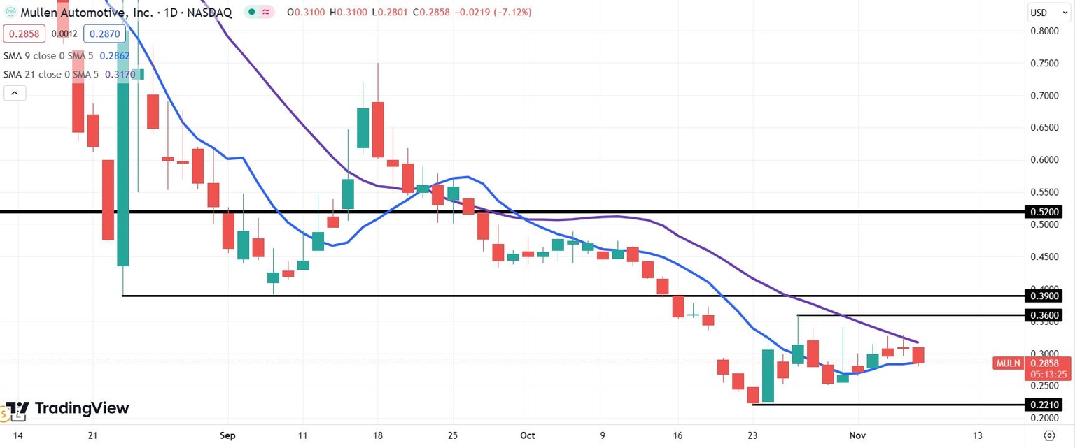 Mullen stock attempted to hold onto the 9-day SMA on the daily chart on Tuesday but failed. The past few sessions have been the first time since mid-September that MULN stock has been able to hold above this moving average, and it was more bad news for the stock's fanbase when it gave way.