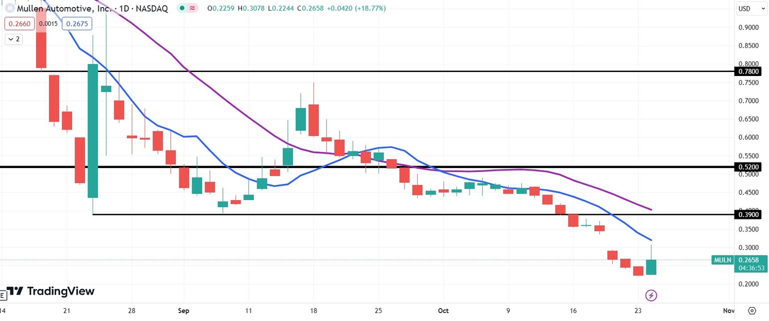 Mullen’s stock price spiked on Tuesday, rising over 35% in several instances. The large-scale rally failed to even reach the 9-day Simple Moving Average (SMA), however. After dropping below the $0.39 support level on October 16, the $0.39 threshold now becomes the primary objective of bulls to regain. Importantly, it is also nearly in line with the 21-day SMA, making that level even more significant.