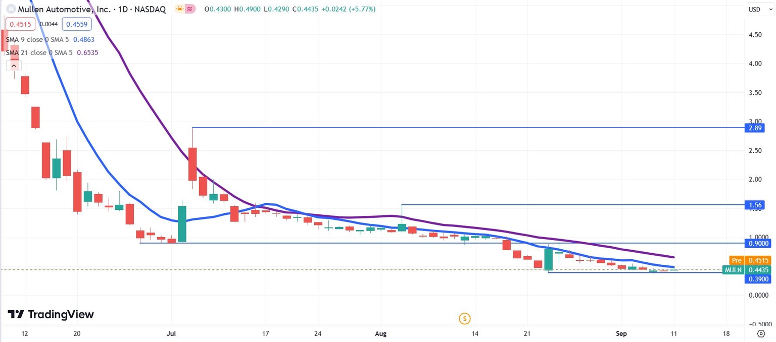 Mullen stock could be in the early innings of a resurrection in share price. Thus far, it has managed to remain above the August 23 low at $0.39. The 9-day Simple Moving Average and the 21-day SMA need to be conquered at $0.48 and $0.65, respectively. From there, an overthrow of the $0.90 support level from June will bring bulls back into the trade.