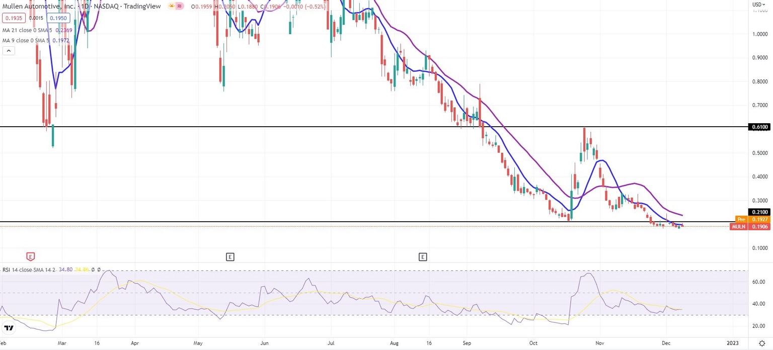 MULN stock has dropped below the $0.21 threshold and mostly remained below it since November 25. To sustain a rally off the recent news, MULN bulls need to power above that price level and then push shares above the 21-day moving average. That moving average currently sits at $0.2369. MULN stock just registered a new all-time low this week at $18 on December 7. One problem is that the Relative Strength Index (RSI) is not currently oversold at these extremely low levels.