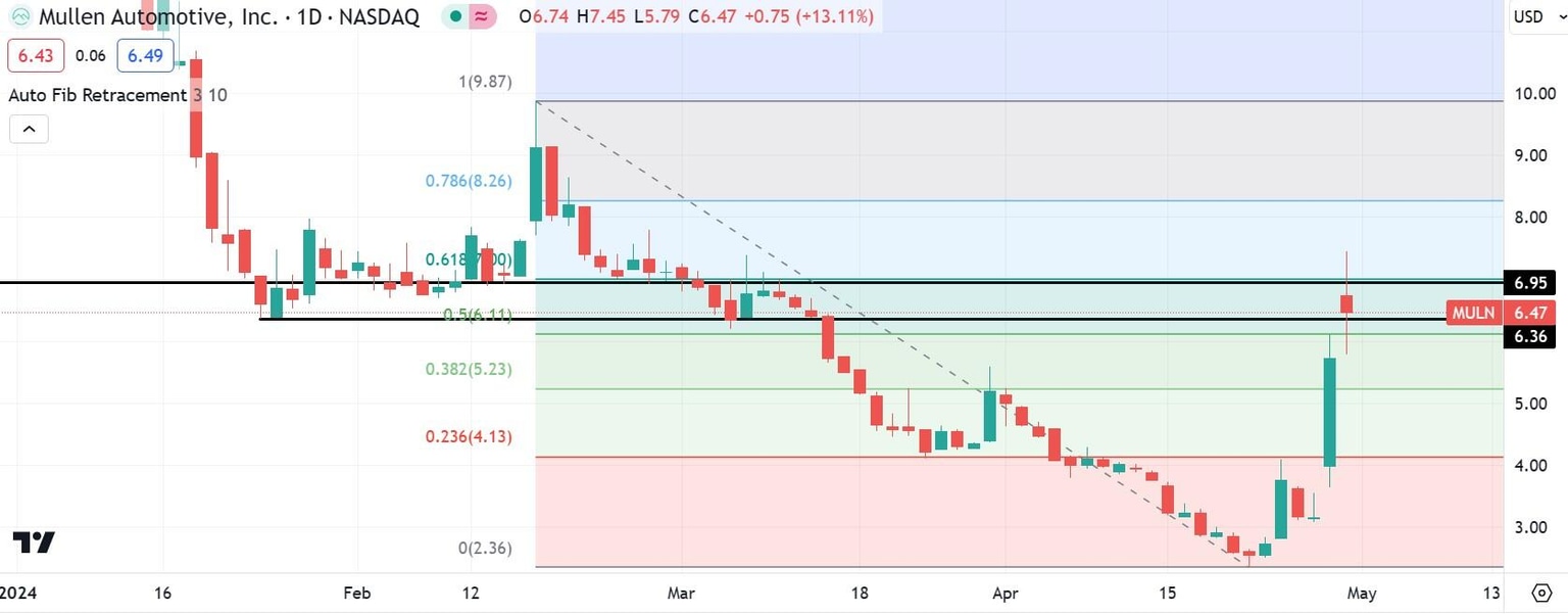 Mullen stock has risen on Tuesday to trade mostly within the $6.36 and $6.95 range. Those price levels stem from support and resistance levels when MULN traded somewhat sideways in late January through early March.