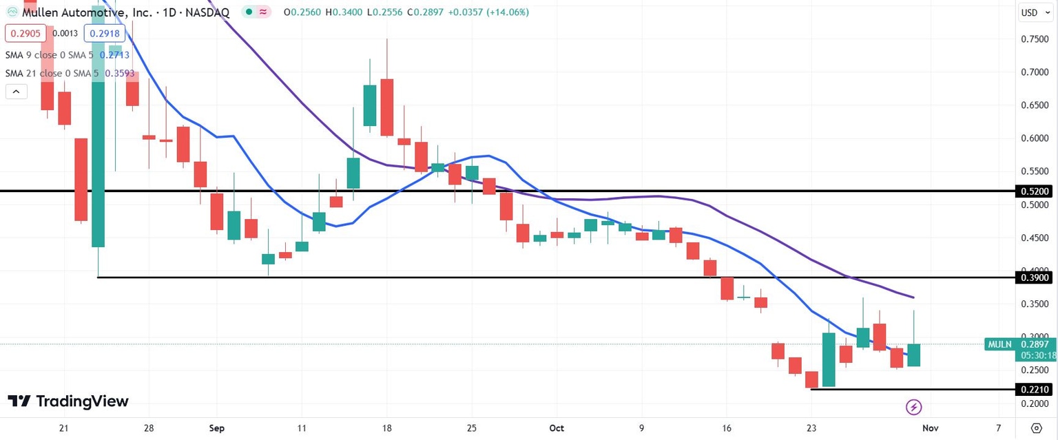 Bulls will need to push the MULN share price above the 21-day Simple Moving Average (SMA) if they want any sustained rally to occur. The 21-day SMA is moving just below $0.36 on Tuesday. Most traders will likely wait for the reverse split to arrive in December. Support just above $0.22 stems from the floor found there on October 23 and 24.
