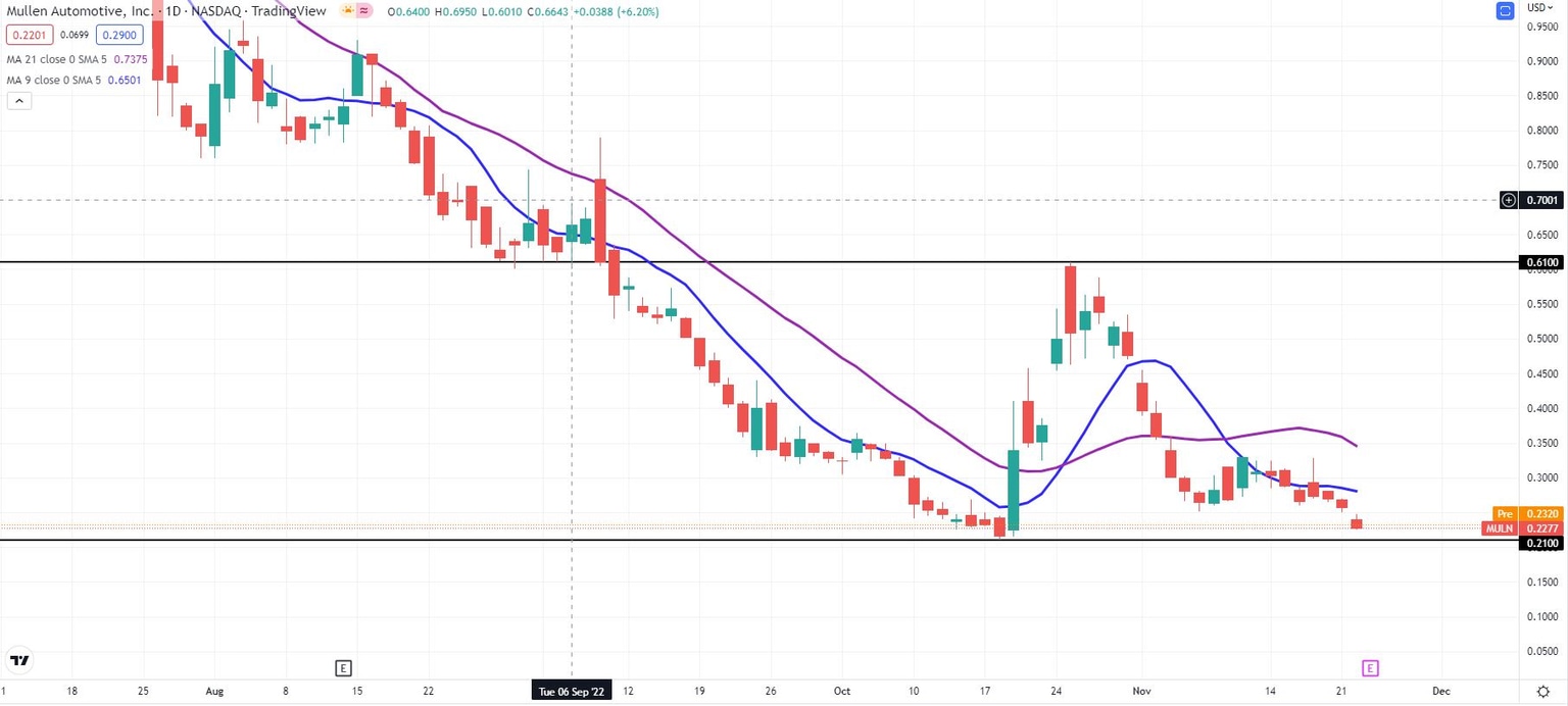 Mullen stock has been shifting lower since October 25, ignoring a short period rebounding in the first half of November. MULN stock has dropped nearly 22% in just five sessions, and Tuesday’s drop was a big part of that. Mullen’s share price has closed below its open on seven consecutive sessions.